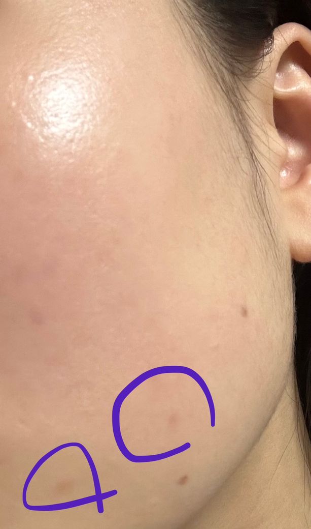 사진상 표시된 병변은 경계가 뚜렷하지 않은 옅은 홍반성 구진 형태로 보이며, 농포나 심한 염증 소견은 없습니다. 사용 직후 반복적으로 같은 양상이 생긴다면 기기 자극에 의한 일시적 피부 반응 가능성이 가장 높습니다.
