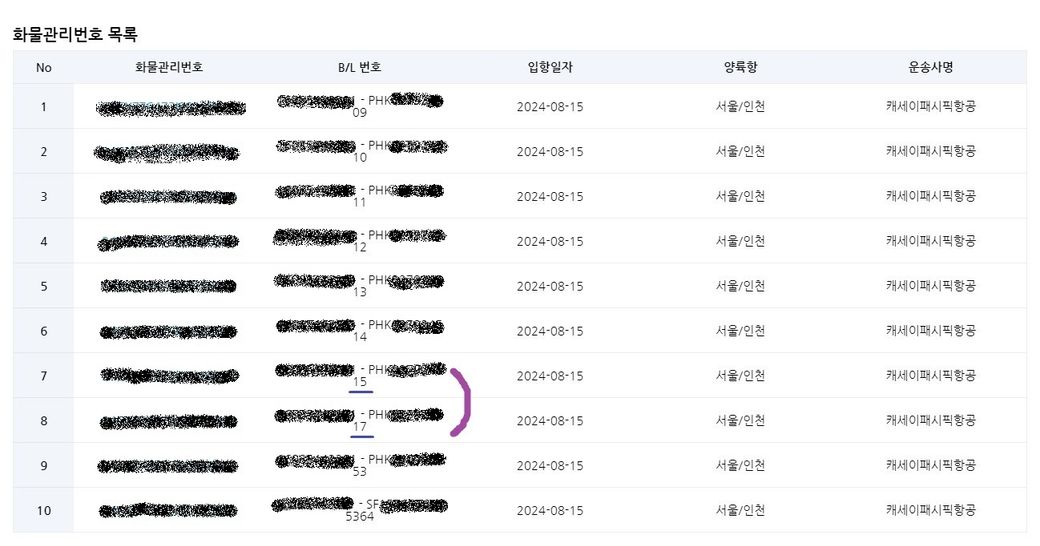 AWB 넘버(M B/L)로 유니패스에서 조회한 화면인데 옆에 H B/L중 제 운송장 번호만 없습니다.