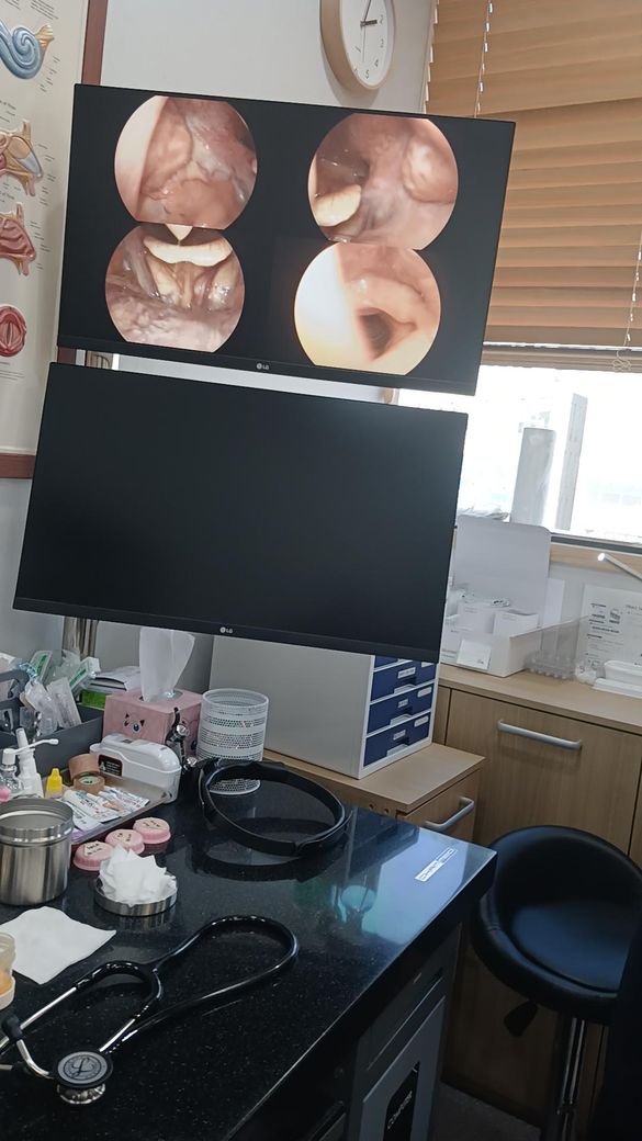 사진에 보이는 건 **후두경 화면(후두·인두 점막)**이고, 그 안에 하얗게 늘어진 것처럼 보이는 부분은 ‘침이나 점액(가래성 분비물)’일 가능성이 매우 높습니다.