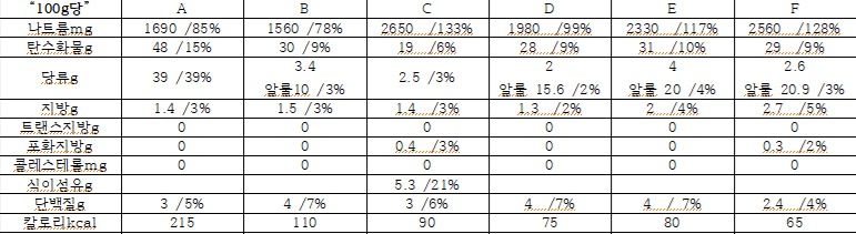 피하셔야 할 제품은 A입니다. 당류가 39g으로 사실상 설탕물입니다. 반면 F는 칼로리가 가장 낮지만 나트륨이 너무 과해(128%) 3위로 선정했습니다.