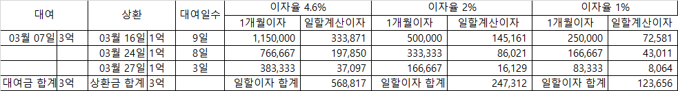 이자율 4.6%, 2%,1%으로 1개월이자 산출후 일할계산이자를 각기 계산해서 표로 정리해보았습니다.