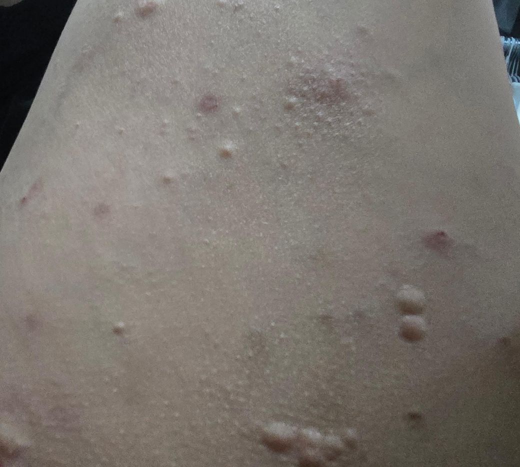 사진상 병변은 전형적인 팽진(wheal) 형태의 두드러기와는 다소 다릅니다. 일반적인 두드러기는 수시간 이내 사라지고 흔적을 남기지 않는 것이 특징인데, 현재 병변은 구진과 결절이 반복적으로 생기고 일부는 색소침착이나 흉터를 남기는 양상으로 보입니다. 이는 단순 급성 알레르기성 두드러기보다는 만성 자극성 또는 염증성 피부질환 가능성을 고려해야 합니다.
