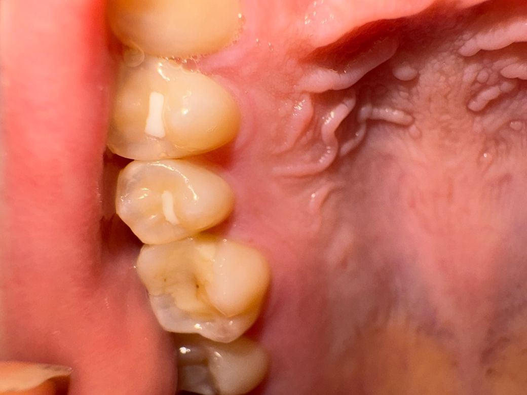 최대한 자세히 찍어봤는데 뜨거운것,창가운물 머금어도 아프진 않아요 근데 달달한 소스 먹다 갑자기 시린 통증있어 물마시니 괜찮아 졌는데 검은 점이 보여서 치료 언제쯤 받으로 가는게 좋을까요? 좀 바빠서 어느정도 밀 수 있는지 ㅠㅠ 충치인가요 아님 어제 먹은 김인가요 양치해도 안사라져서 ㅠ