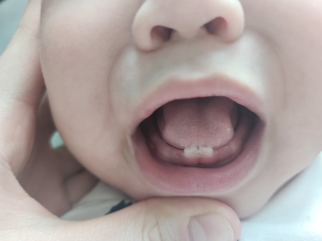 아이가 이유식을 하는경우 치아 사이에 치태 또는 치석이 약간 쌓인거 같습니다. 칫솔로 제거가 안되면 치과에 가셔서 제거를 해야될수도 있습니다.