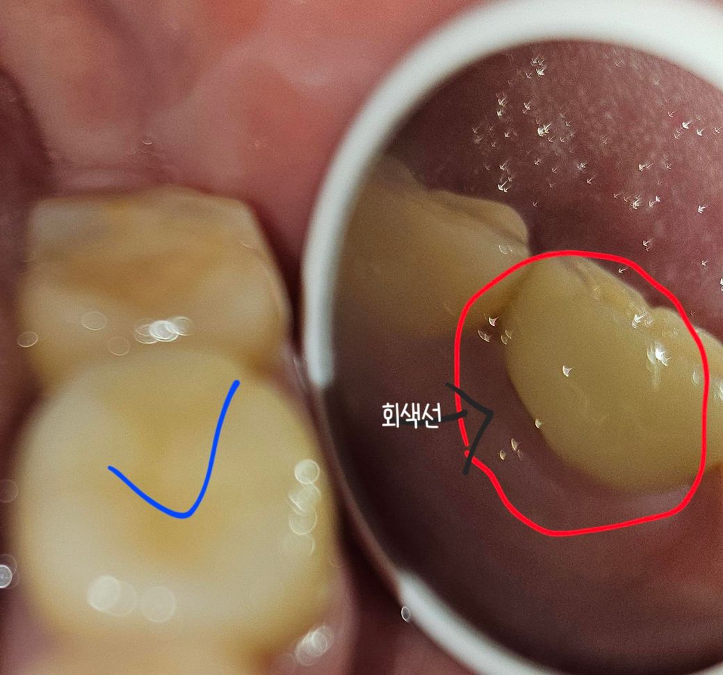 크라운과 잇몸 경계 회색선은 충치라고 단정지을 순 없습니다. 크라운 붙이는데 사용한 접착제(시멘트)가 산화되어 그렇게 보일 수도 있습니다.