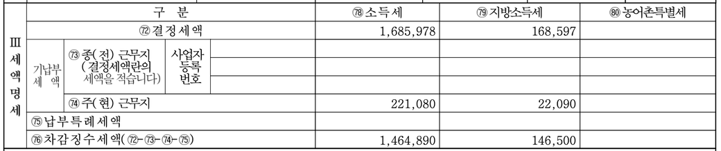 2번째 사진에서 73번 결정세액 62만원이라는 의미는, 질문자님께서 국가에 납부한 세금이 62만원이라는 뜻입니다.