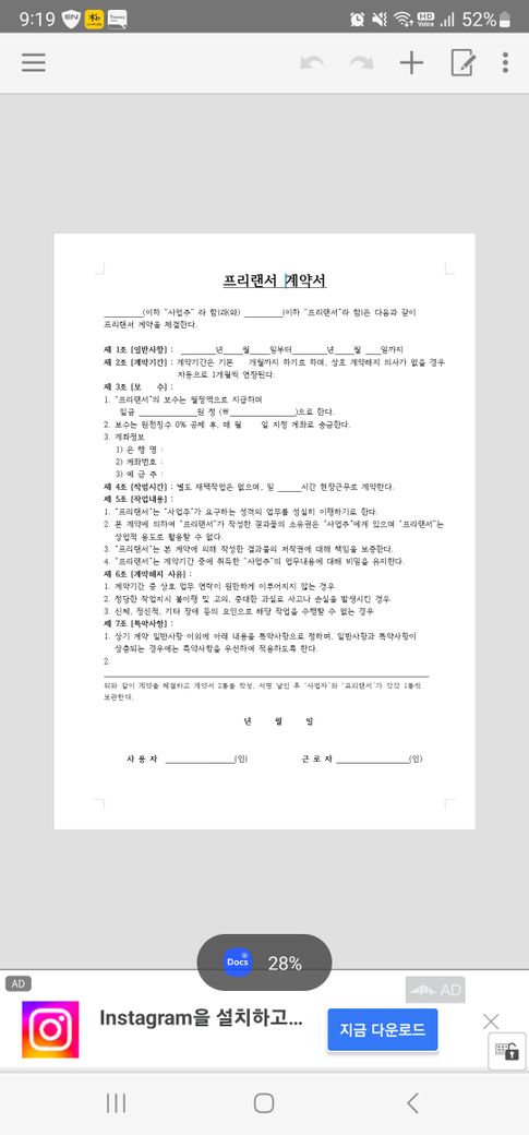 사업장으로 출퇴근하는 프리랜서 고용 계약서를 직접 만들었습니다.