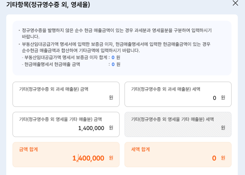 이렇다하면 기타(정규영수증 외 영세율 기타 매출분)금액 칸에 입력을 해야 하나요? 사진 첨부합니다.