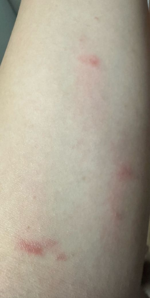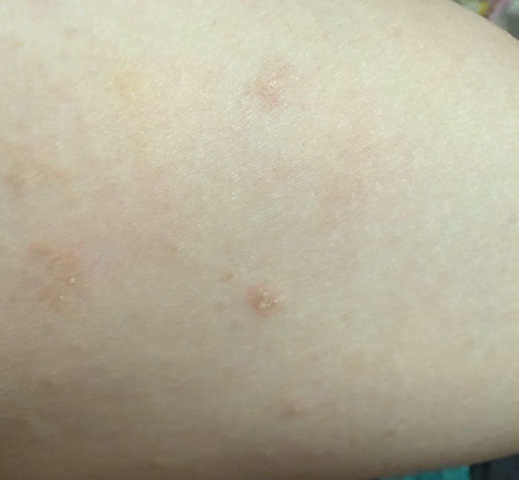 사진상 병변은 작고 흩어진 붉은 점·반점 형태이며, 일부는 긁혀 번지거나 색소침착처럼 보입니다.