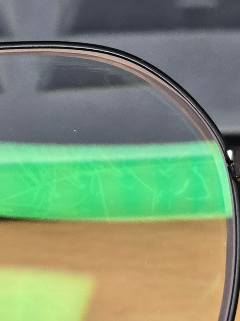 안경에 문제가 있네요. 스크래치난 걸 모르고 팔았을 수도 있습니다. 반사광에 비쳐서 봤을 때 보이는 정도면 본인들도 아마 몰랐을 겁니다. 한번 매장에 들러서 문의해보시죠.