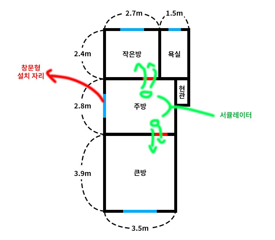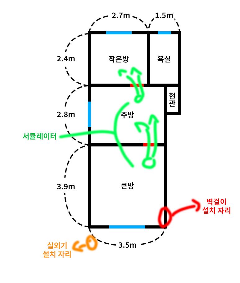두번째 사진은 큰 방에 벽걸이 6~7평짜리 달아서 큰방 > 주방 > 작은방 이렇게 서큘레이터로 냉기를 순환 시켜주도록 생각중입니다