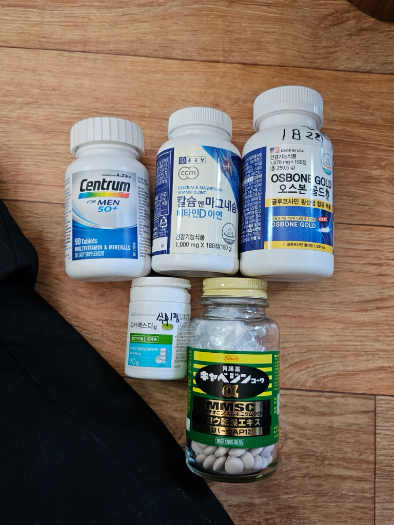 약 복용에 관한 질문을 주셨습니다. 우선 뼈 건강을 걱정하는 것으로 보입니다. 3종류가 뼈와 연골과 관련한 약입니다. 센트롬, 카베진은 평소와 같이 드시면 되겠습니다. 나머지 3종류 중 칼슘앤마그네슘은 빼도 될것 같습니다. 디카맥스디와 오스본골드만으로도 충분 할 것으로 보입니다.