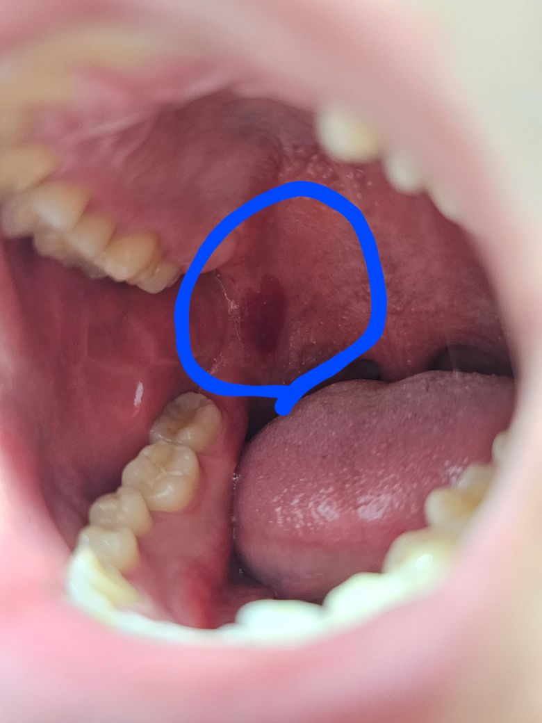 구내 혈종이 터진게 아닐까 싶습니다. 감염 가능성이 있기 때문에 이비인후과 또는 치과가서 소독 처치를 받는 것을 추천드립니다.