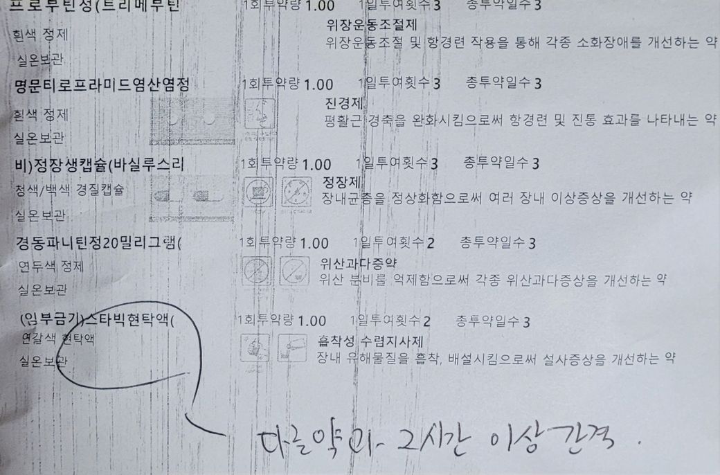 스타빅현탁액은 흡착성이 있는 약이기때문에 처방약 뿐만 아니라 다른 약도 간격을 둬야합니다.