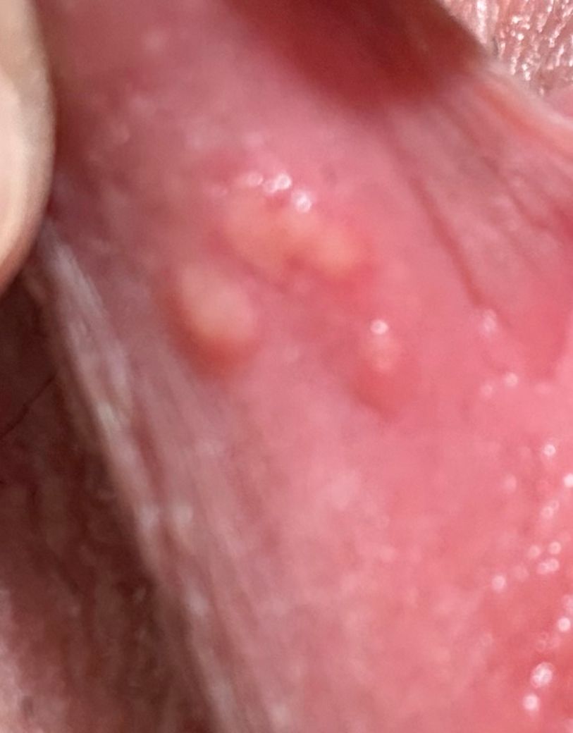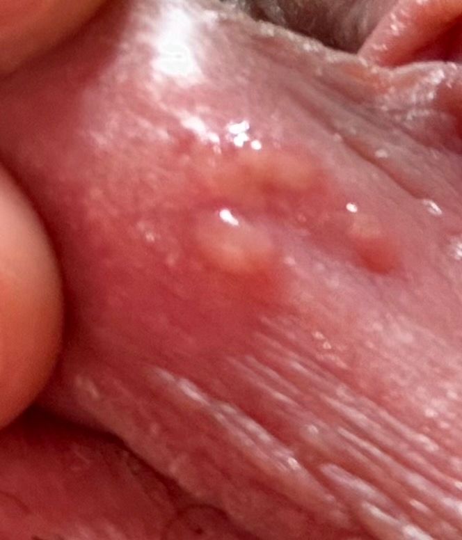 수포성 병변이라서 성기 헤르페스 가능성도 고려해서 확인을 해 봐야 될 것 같습니다. 산부인과에 가셔서 바로 진료를 받아보시지요.