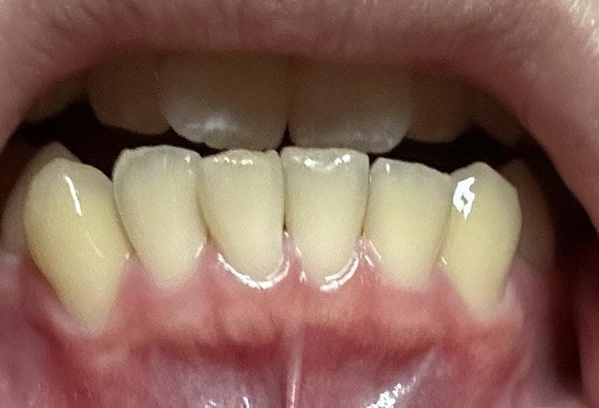 사진으로만 봤을 경우에는 잇몸 퇴축이 크게 진행된 것으로 보이진 않습니다 양치질을 할 때 잇몸에 자극이 세게 되면 잇몸이 퇴축될 수 있기 때문에 잇몸에 너무 많은 힘이 가해지지 않도록 하는 것이 좋습니다