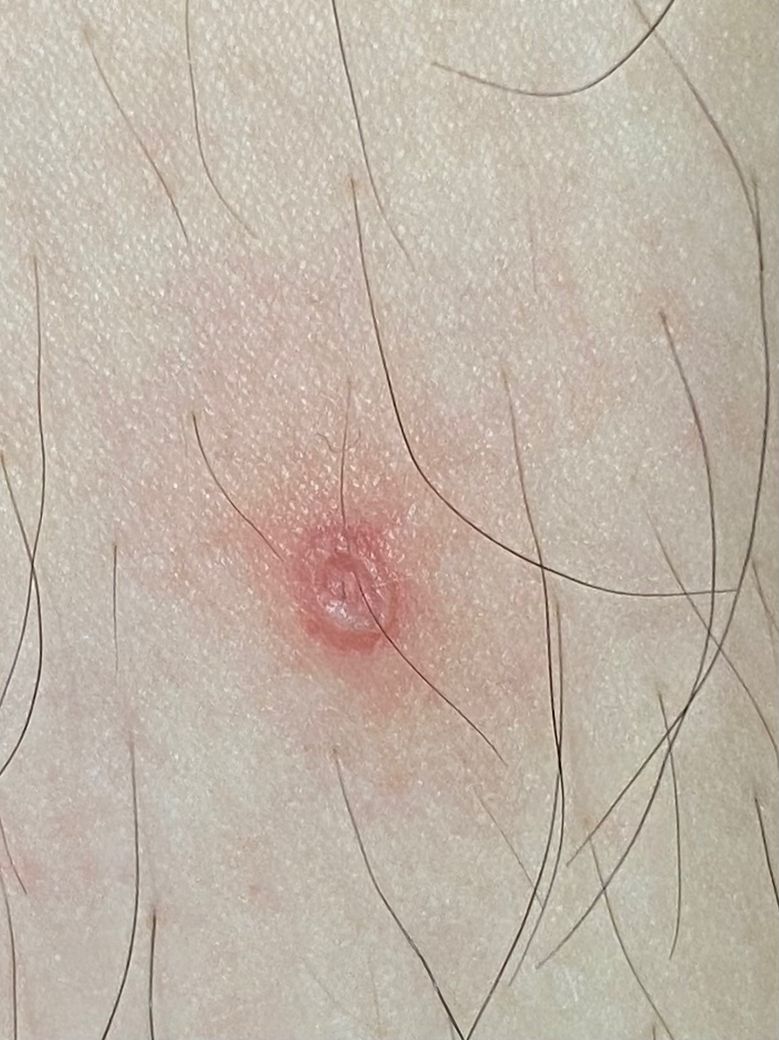 작은 모낭염 가능성이 높습니다. 통증이 심하지 않고 병변에서 진물이나 농포 등이 발생하지 않는다면