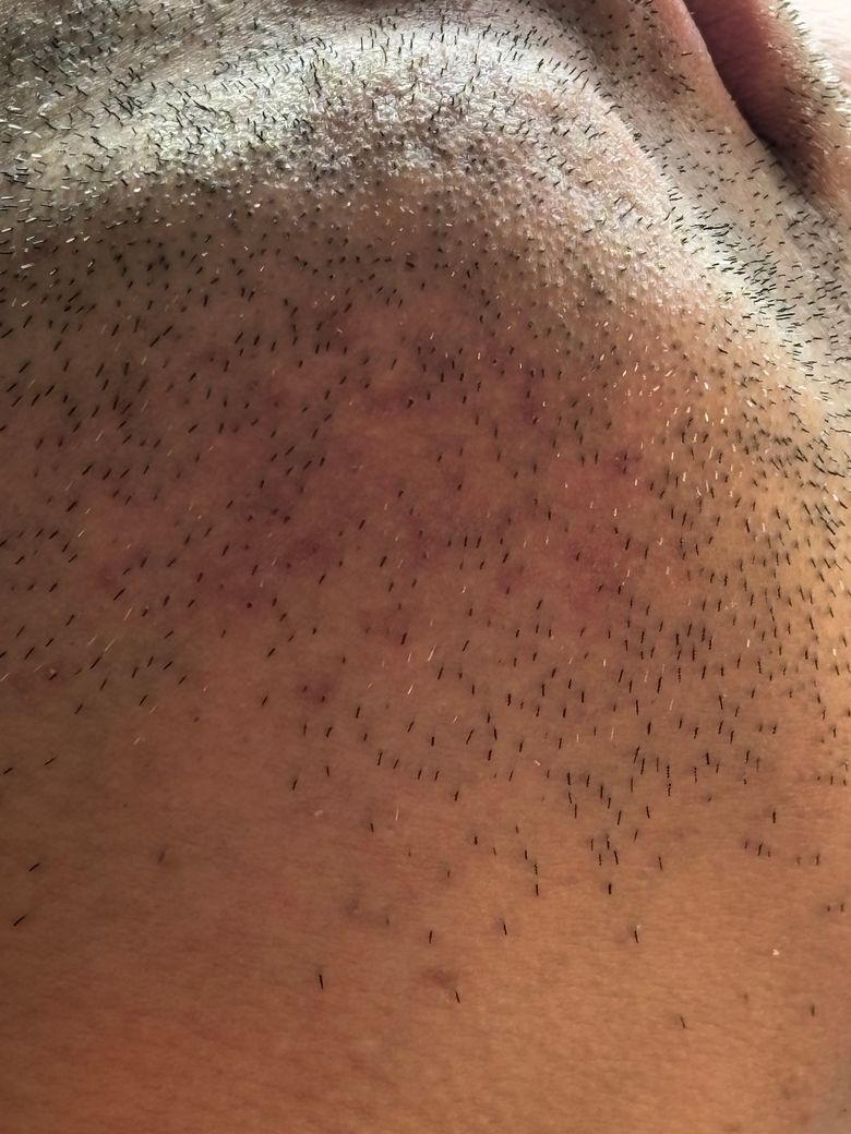 직접 전문의 진료를 보는 것이 가장 정확하겠지만, 수염 부분에 모낭염이나 일시적인 자극으로 인한 붉은 변화가 생긴 것 같습니다.