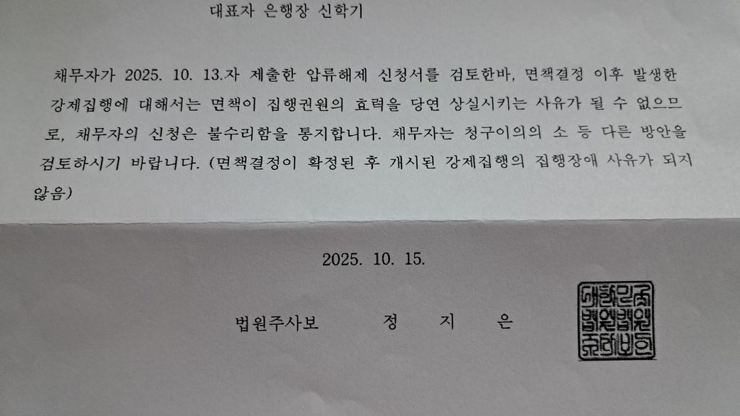귀하가 받은 ‘불수리 통지서’는 이미 개인회생이나 파산 면책이 확정된 후 새로 제기된 압류·추심명령 신청이 효력을 갖지 못한다는 이유로, 법원이 신청을 각하(접수 불가)한 것입니다. 면책으로 인해 해당 채무는 법적으로 소멸했기 때문에, 동일한 채권으로 강제집행을 요구하는 것은 불가능합니다. 따라서 현재 단계에서 채권자는 집행 절차를 다시 진행할 수 없으며, 귀하로서는 실질적으로 법적 책임이 면제된 상태입니다.법리 검토