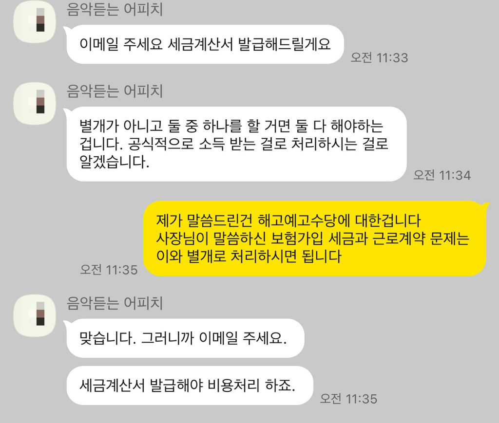 해고예고수당과 받았는데 세금계산서 보낼테니 비용 청구하래요