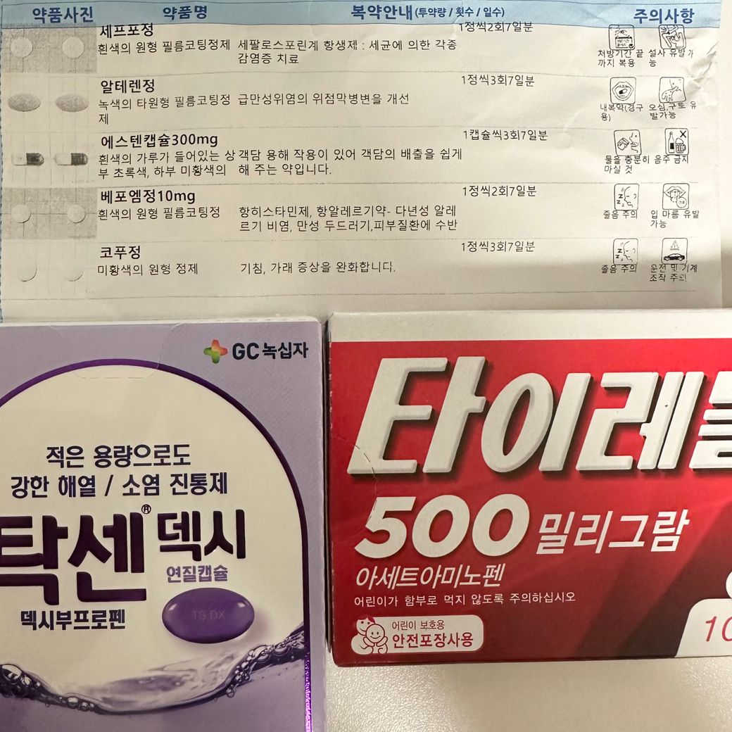 현재 조제약은 항생제 위장약 가래약 알러지약 기침가래약입니다 말씀하신 탁센덱시는 소염진통제이고 타이레놀은 해열진통제입니딘