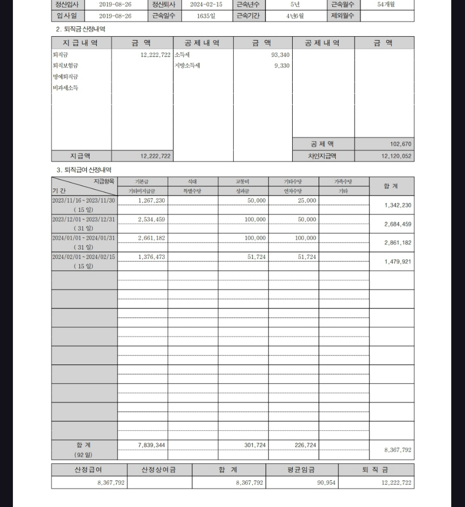 위 퇴직금 산정내역은 퇴직 일시금 또는 DB형의 계산방법이고 DC형은 매년 임금총액의 1/12를 납입하고 운용수익이 붙는 것입니다.