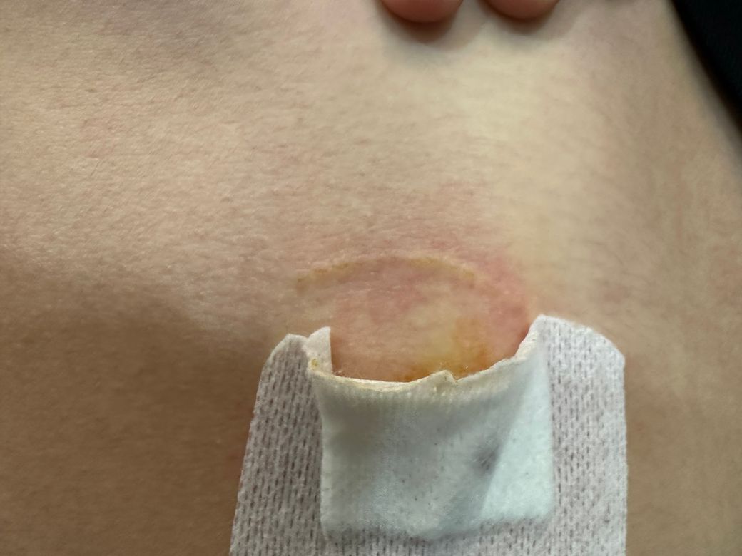 밴드의 접착부위를 따라서 알레르기반응을 일으킨 것으로 보이며 밴드를 즉시 제거하는 것이 도움이 됩니다.