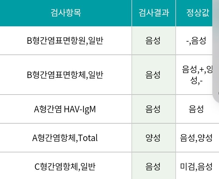 A형감염 항체가 있는 것은 정상으로, 예방접종 후 항체 생성이 되어 간염 바이러스에 대해 저항력이 있다는 의미입니다. 반면, IgM은 감염 직후 증가하는 것으로 음성이 정상입니다. B형감염의 경우도 항체가 양성인 것이 저항성이 있다는 정상소견이고 항원은 감염을 의미하는 것으로 음성이 정상입니다.