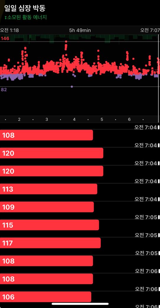 2-3시간 자다가 심장이 두근대서 일어나니까 심박수가 100-120까지 계속 왔다갔다했어요.