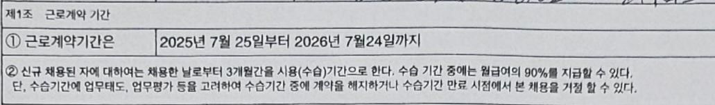 근로계약기간이 2025년 7월 25일부터 2026년 7월 24일까지라면 만 1년으로 근로계약기간을 정한 것으로 볼 수 있으며, 따라서 근로시간이 1주 평균 15시간 이상이라면 퇴직금이 발생하게 됩니다.