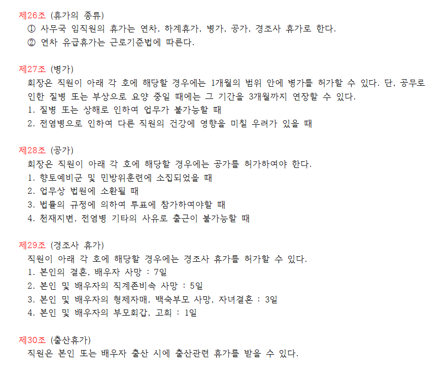 저희 회사 근무규정은 첨부 이미지와 같이 휴가를 명시하고 있습니다.