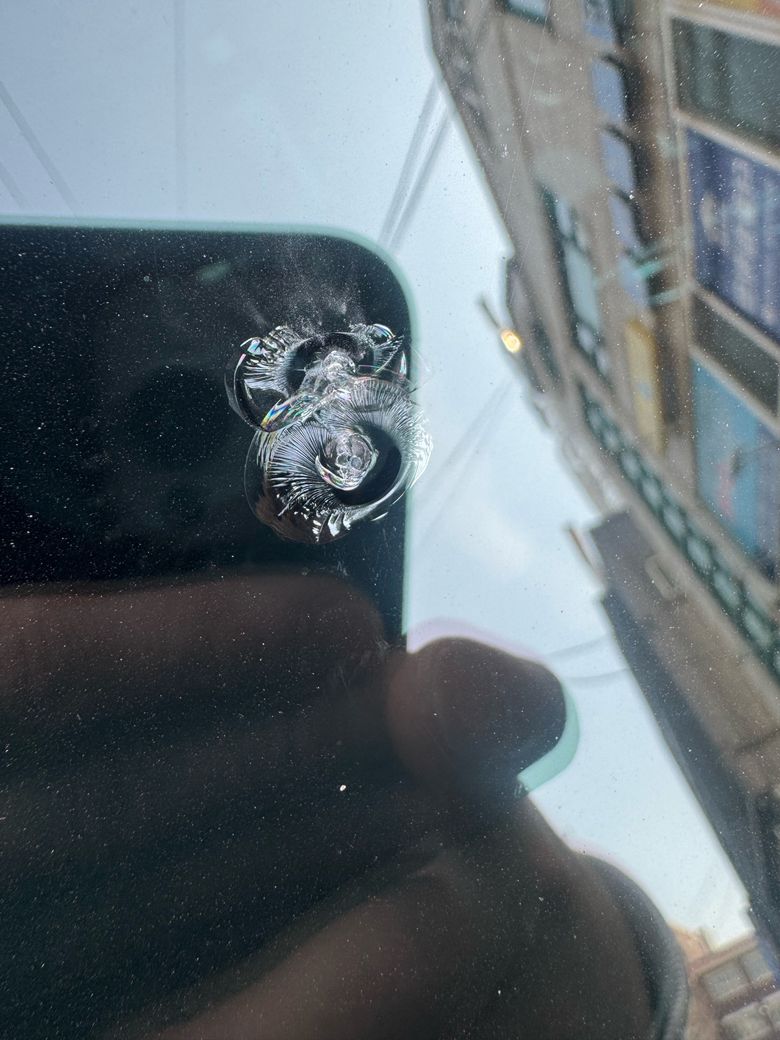 사진 속 크랙은 전형적인 '돌빵(스톤칩)' 형태입니다. 특히 '불스아이(Bull’s Eye)'라고 불리는 원형 크랙이 두 개 겹쳐진 모습인데요.
