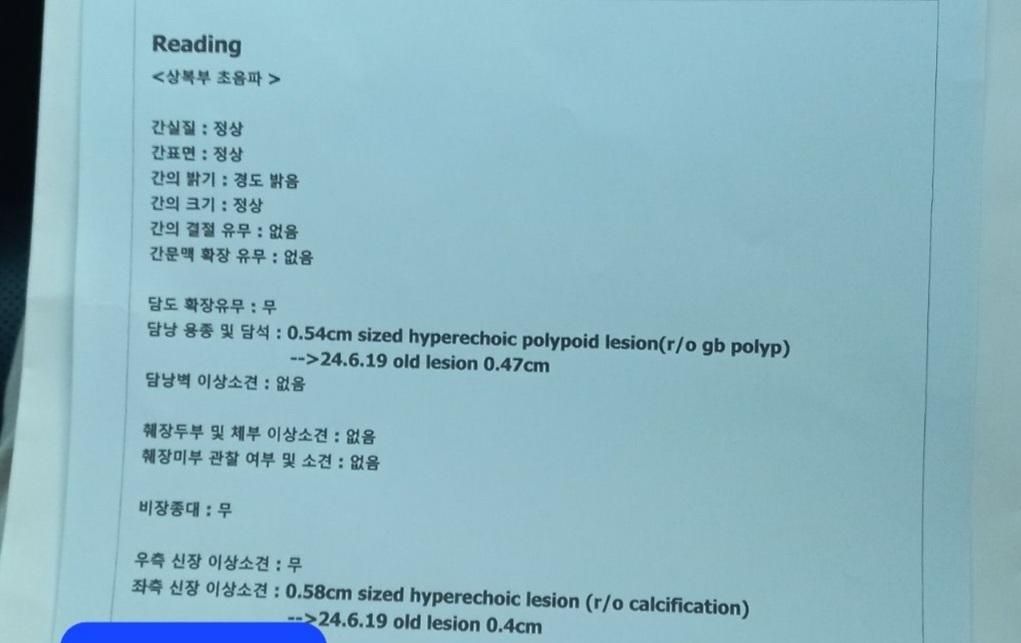 네 맞습니다. 위 판독지 상에는 신장에 높은 초음파 음영을 보이는 병변이 있다고 되어있습니다. 석회화 여부는 분명하지 않아 감별이 필요하다고 되어있습니다. 24.06.19 초음파에도 확인이 되었었고 당시에는 0.4cm였는데 크기가 더 커졌다고 되어있네요.