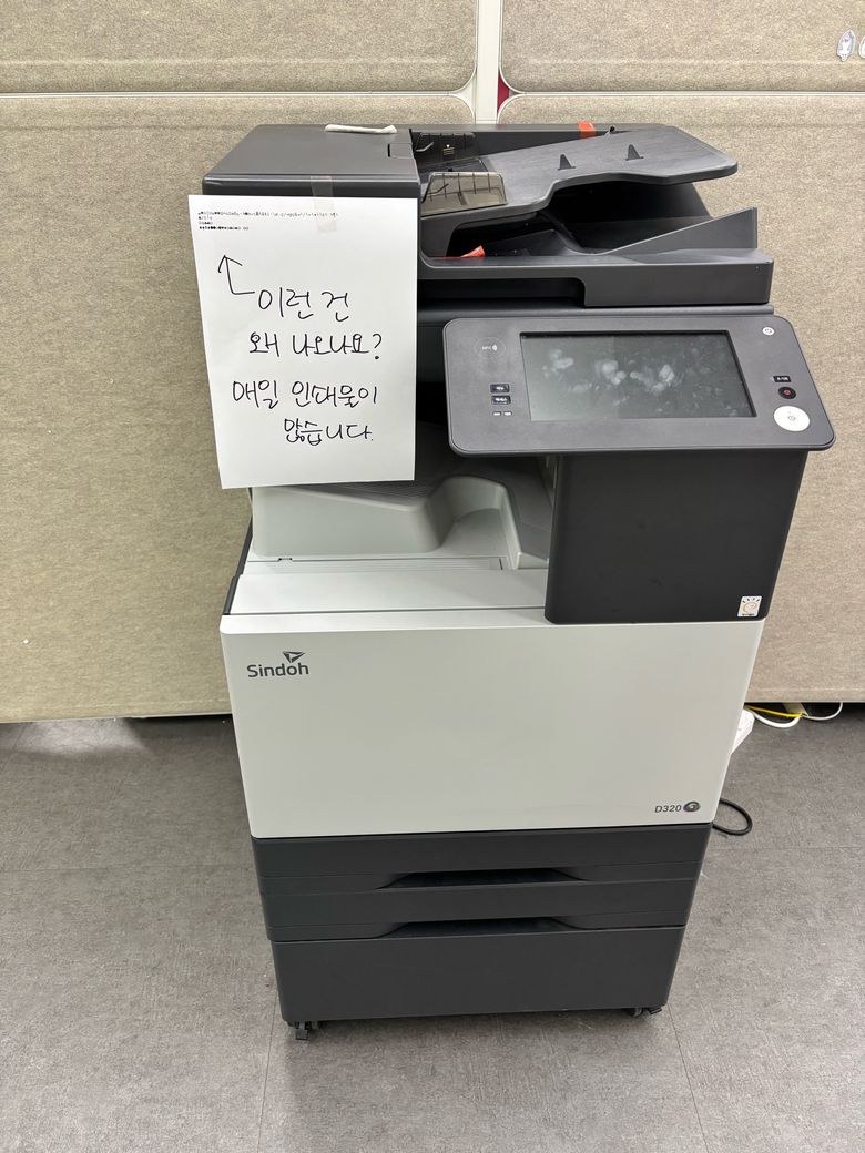저희가 인쇄하려고 하면 다음 사진과 같이 이상한 기호 같은 게 뜹니다. 이 점을 해결하고 싶어서 질문을 올립니다. 참고로 복사기 이름은 Sindoh입니다.