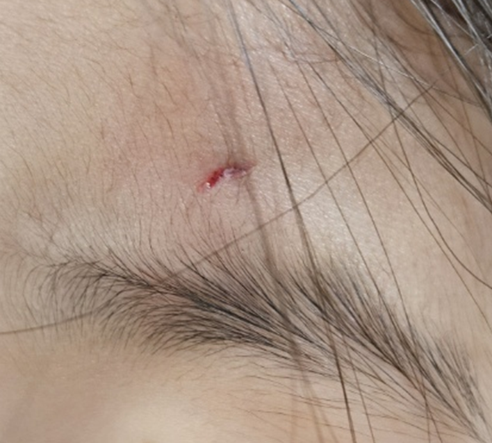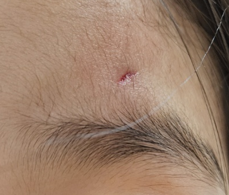 6살 아이입니다. 첫째와 놀다가 앞니에 부딪혀서 이마에 찍힘 상처가 생겼습니다.