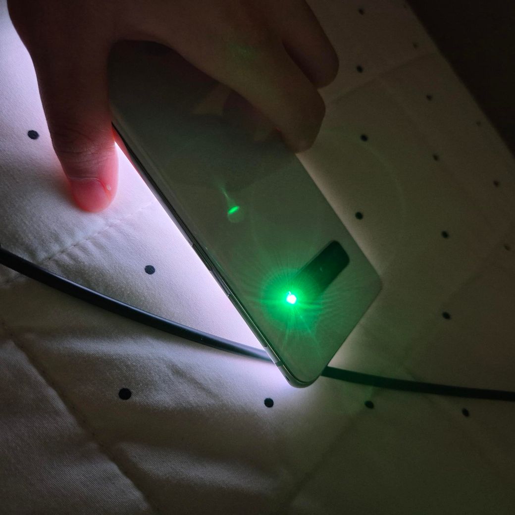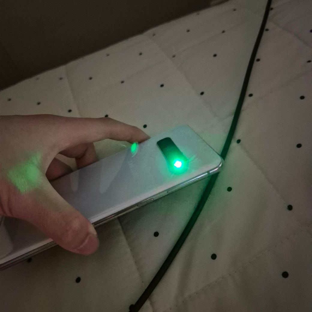 초록불은 갤럭시 S10의 심박수 센서에서 나오는 빛입니다.
