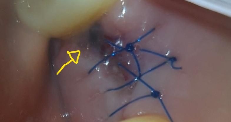 재채기 하며 강한 음압을 만드는 행위는 조심해주시는 것이 좋기는 합니다. 되도록이면 압력 가해질 만한 행위(코풀기 등)은 금해주시는 것이 좋으며 사진 찍어 주신 부위는 치유중인 상태로 보입니다. 봉합사 및 하방의 이식재 등이 비쳐보이는 것으로 사료되며 연조직은 치유중인 것으로 보입니다.