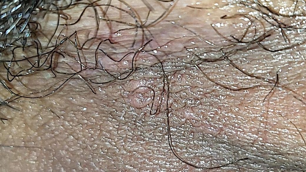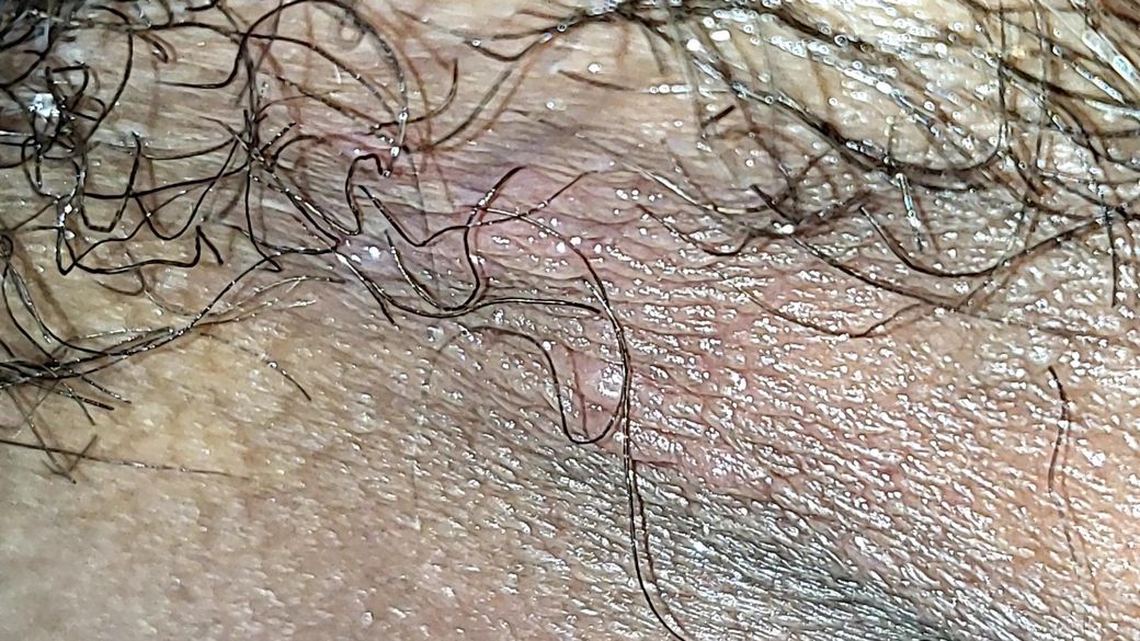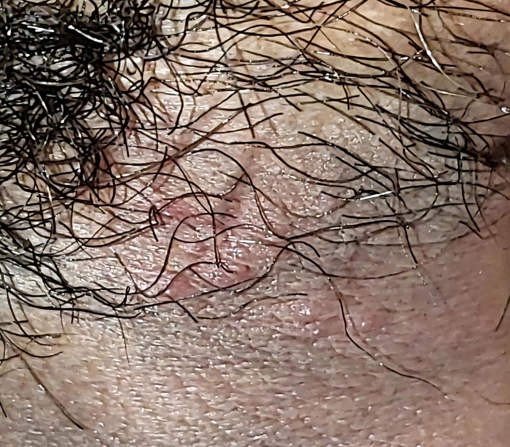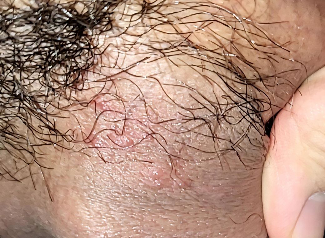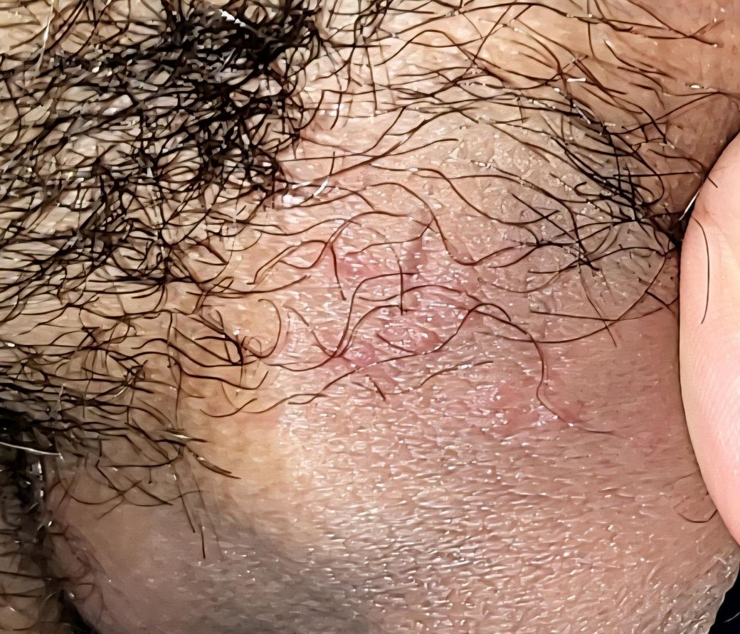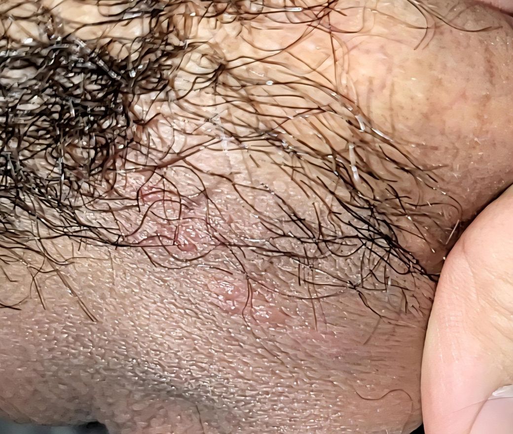 사진상 병변은 음낭과 음경 기저부 접히는 부위에 국한된 1–2 mm 크기 홍반성 구진으로 보이며, 명확한 군집성 수포나 미란은 관찰되지 않습니다. 털이 많은 부위이고 마찰·습기가 많은 위치라는 점을 고려하면, 단순포진보다는 모낭염 가능성이 더 높아 보입니다.