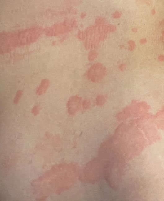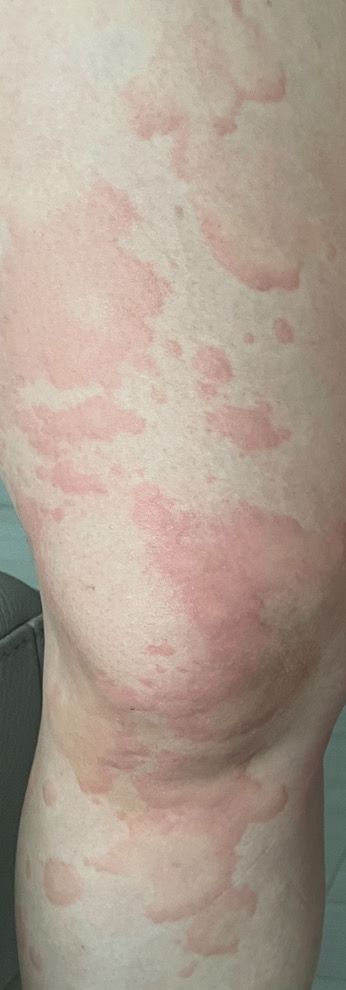 두드러기는 사진과 같이 다양한 패턴으로 넓게 분포하고, 온몸 곳곳에 돌아가며 크게 발현됩니다. (발바닥부터 얼굴 두피까지 전체) 이젠 얼굴까지 발현되어요.