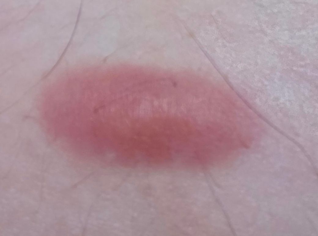주변부 발적과 함께 일부 융기된 병변이 관찰되고 있어 켈로이드 반흔 가능성이 있습니다. 하지만 켈로이드 반흔은 피부 손상 후 발생하므로 해당 부위에 피부 손상이 있었는지 확인하는 것이 필요합니다. 켈로이드 반흔의 경우 저절로 호전되지 않는 경우가 많아 스테로이드 국소 주사를 이용하여 치료를 하는 것이 일반적이므로 병변이 지속된다면 피부과 내원하여 진료를 보시는 것을 권해드립니다.
