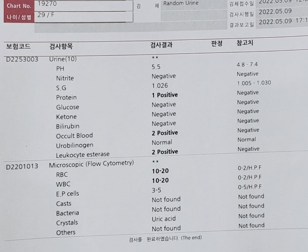 검사 결과를 보시면 단백뇨가 양성이고, 잠혈 (occult blood, 혈액), 백혈구 (lecukocyte esterase), uric acid crystal이 양성입니다.