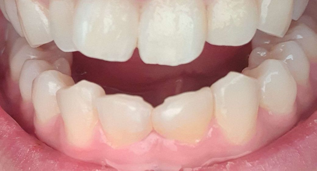 네 사진상 보기에 아래 앞니 2개가 결손인 상태이고, 아마 그때 앞니가 벌어져 있는 상태였지 싶습니다. 그 사이를 레진으로 메꾸는 처치를 한 것 같습니다. 아직까지 잘 붙어있다면 별 문제 없이 쓰시면 됩니다. 해당 부위는 어차피 좁아서 임플란트는 못심을 것 같습니다.