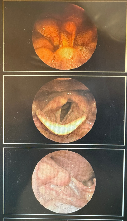 보입니다. 사진만으로는 아직 확진은 어려우며 성대 마비만 관찰되는