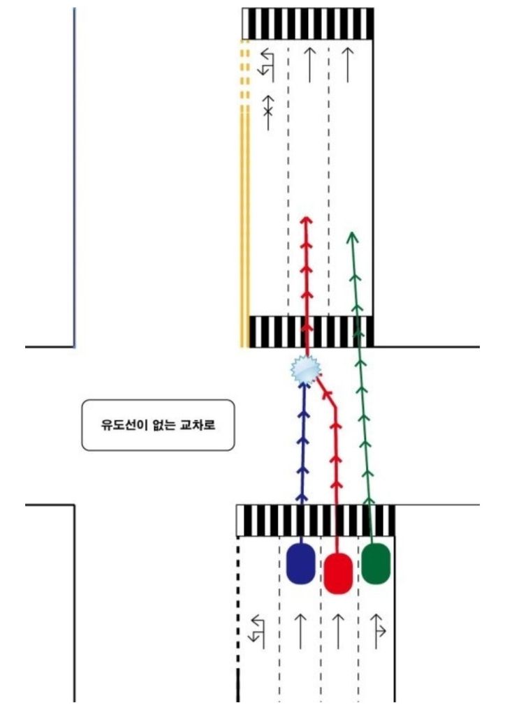 위와 같이 차로가 감소하는 교차로의 경우 1차선은 좌회전이고 2차선 부터 직진 차선이기 때문에 교차로 통과시 2차선 차량이 1차선으로 진행을 해야 합니다.