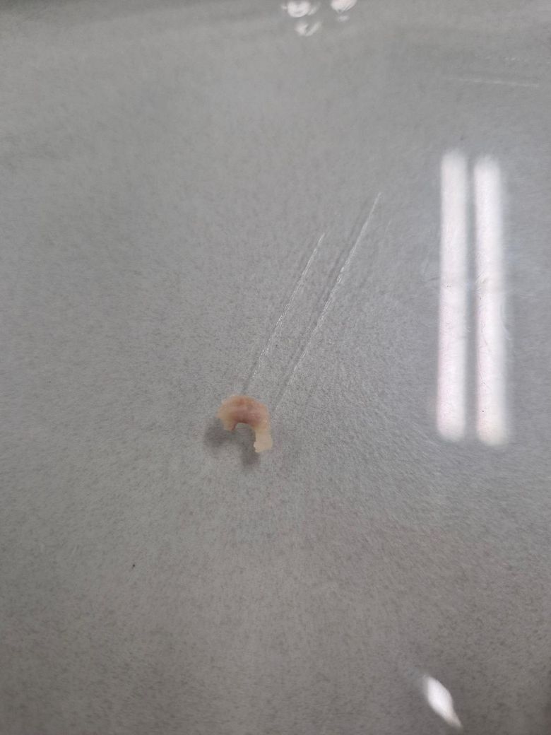 네 사진상 치아 절편 내지는 뼛조각 같네요. 해당 부위 혹시나 모를 감염 방지 위해 항생제 며칠 복용하시면 되겠습니다
