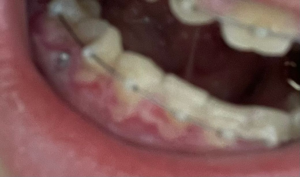 일반적이 경우에는 1~2일 정도 불편감이 있으며 서서히 사라집니다. 현재 사진이 정확하지 않아 말씀드리기 어려운 부분이 있습니다. 다만 교정 장치로 인하여 해당 부분의 위생 관리가 안되고 있었다면 추가적인 감염으로 불편감이 나타날 수 있으므로 계속해서 불편하다면 치과를 바로 가 보시는 것을 권해드립니다.