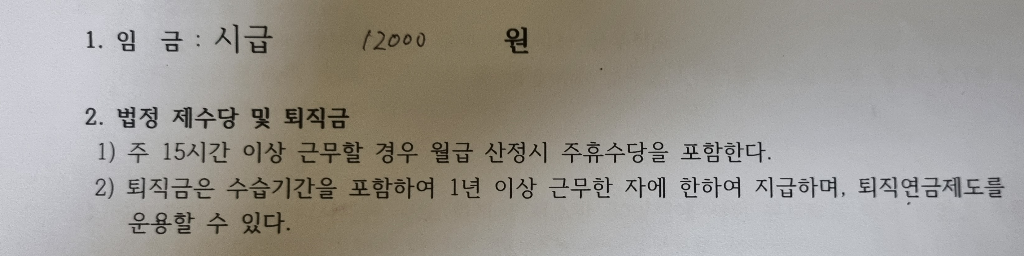 2. 계약서의 내용만 보았을때는 시급에 주휴수당을 포함한다는 내용이 없기 때문에 시급 12,000원에 대한 주휴수당이