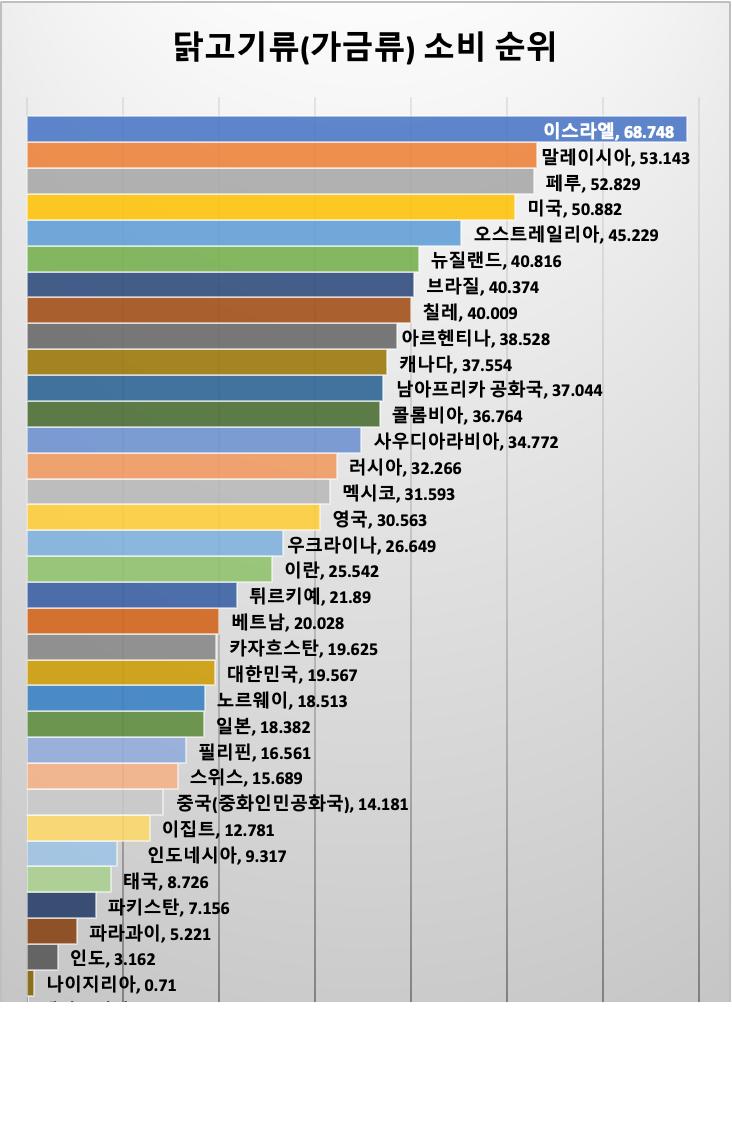 저도 한국이 치킨부터 시작해서 삼계탕, 닭도리탕, 닭발 이런거 많이먹어서 닭 소비량이 높을 줄 알았는데, 생각보다는 높지가 않네요.