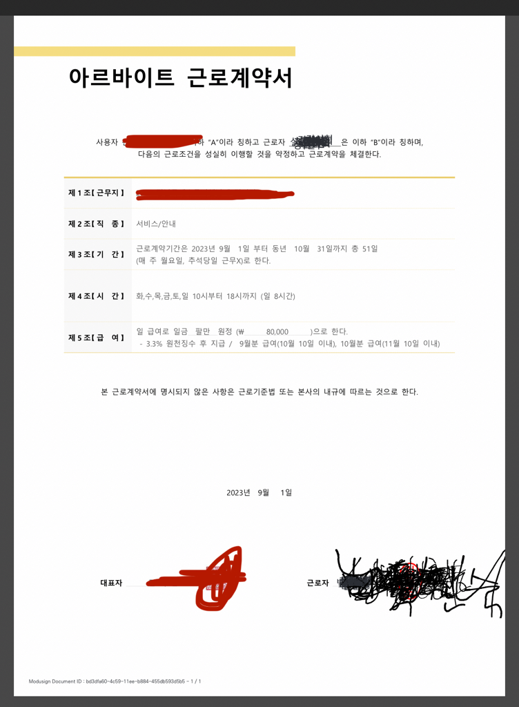 3. 휴게시간이 계약서 상에 나와있지 않고 실제로 약 한달 반 정도를 휴게시간없이 교대로 밥만 먹고 근무 했습니다.