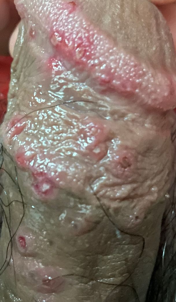 안녕하세요. 조성진 의사입니다. 사진상으로는 명확하지 않으나 헤르페스 가능성이 있습니다.피부과 나 비뇨기과 진료를 보시고 정확한 원인을 찾아 치료를 받으시길 권유드립니다.